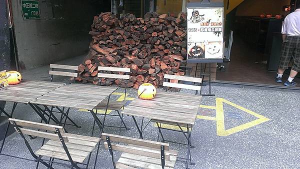 還有木頭堆放在門口, 門外也有座位區,感覺有萬聖節的氣氛